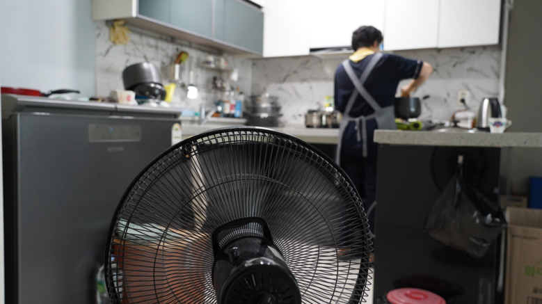 | ▲ 부평종합재가센터 소속 요양보호사가 선풍기 바람에만 의존해 서비스 이용자 자택에서 요리하고 있다. |