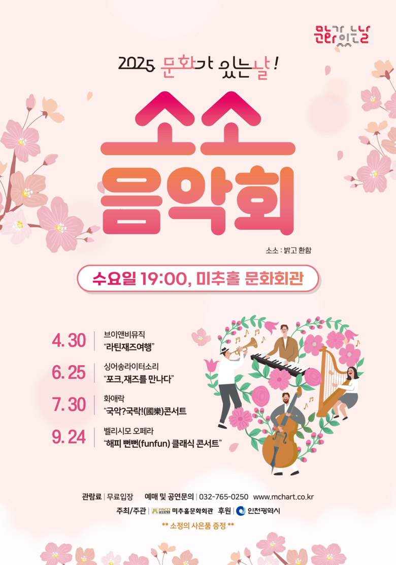 ‘소소 음악회’는 인천 시민 누구나 무료로 관람할 수 있으며, 자세한 내용은 미추홀문화회관 누리집(www.mchart.co.kr)에서 확인할 수 있다.