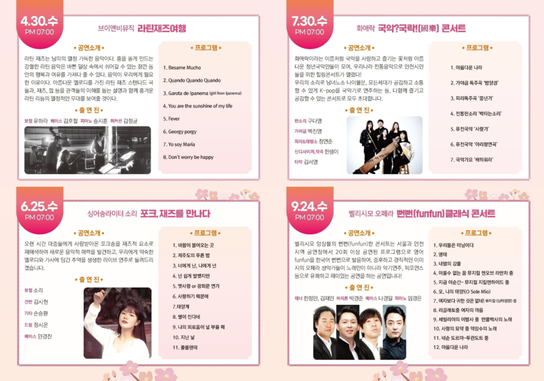 한편, 인천시는 지난 4월 30일 ‘라틴재즈여행’, 6월 25일에는 ‘포크, 재즈를 만나다’를 주제로 소소음악회를 개최한 바 있으며, 오는 9월 24일에는 ‘해피 뻔뻔(funfun) 클래식 콘서트’를 주제로 오페라 공연을 이어갈 계획이다. 이를 통해 시민들이 계절마다 다양한 장르의 공연을 즐길 수 있도록 기획했다.