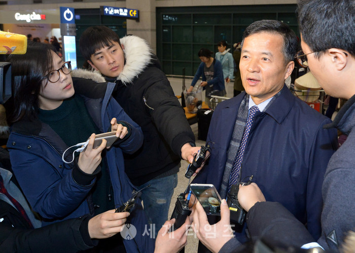 유재경 주미얀마대한민국대사관 대사가 31일 오전 인천국제공항을 통해 귀국해 취재진의 질문에 답하고 있다. 유 대사는 귀국과 동시에 서울 강남구 대치동 박영수 특별검사팀 사무실에 참고인 신분으로 출석 예정이다. 박영수 특별검사팀의 대변인 이규철 특검보는 전날 진행된 정례 브리핑에서 "유 대사를 상대로 최순실씨가 미얀마 공적 개발 원조 사업 과정에서 개인적 이익을 취득한 혐의를 조사할 예정"이라고 전했다. 2017.01.31.