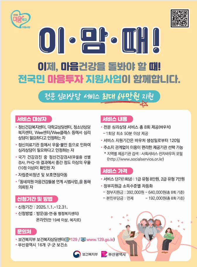 ◈ 심리상담을 원하는 시민은 주소지 행정복지센터에 방문하거나 복지로 누리집(www.bokjiro.go.kr)에서 신청하면 돼 [부산 세계타임즈=이용우 기자] 부산시(시장 박형준)는 우울·불안 등 정서적 어려움이 있는 시민에게 전문심리상담 서비스를 제공하는 「전국민 마음투자 지원사업」을 지난해에 이어 올해도 추진한다고 밝혔다.