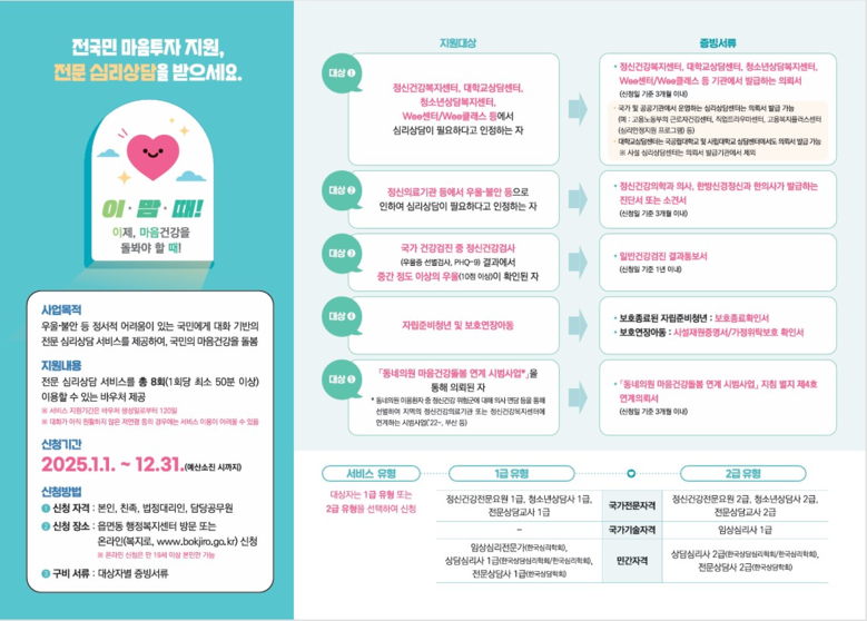 대상자는 민간심리상담기관을 통해 120일간 총 8회(회당 50분 이상)의 일대일(1:1) 대면 심리상담서비스를 제공받을 수 있다.