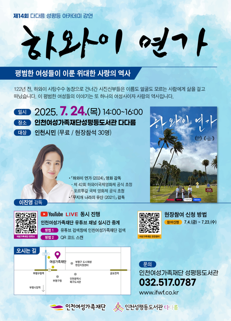 강연은 7월 24일(목) 오후 2시에 인천여성가족재단 1층 인천성평등도서관 다다름에서 열리며, 동시에 재단 유튜브 채널로 온라인 생중계된다.