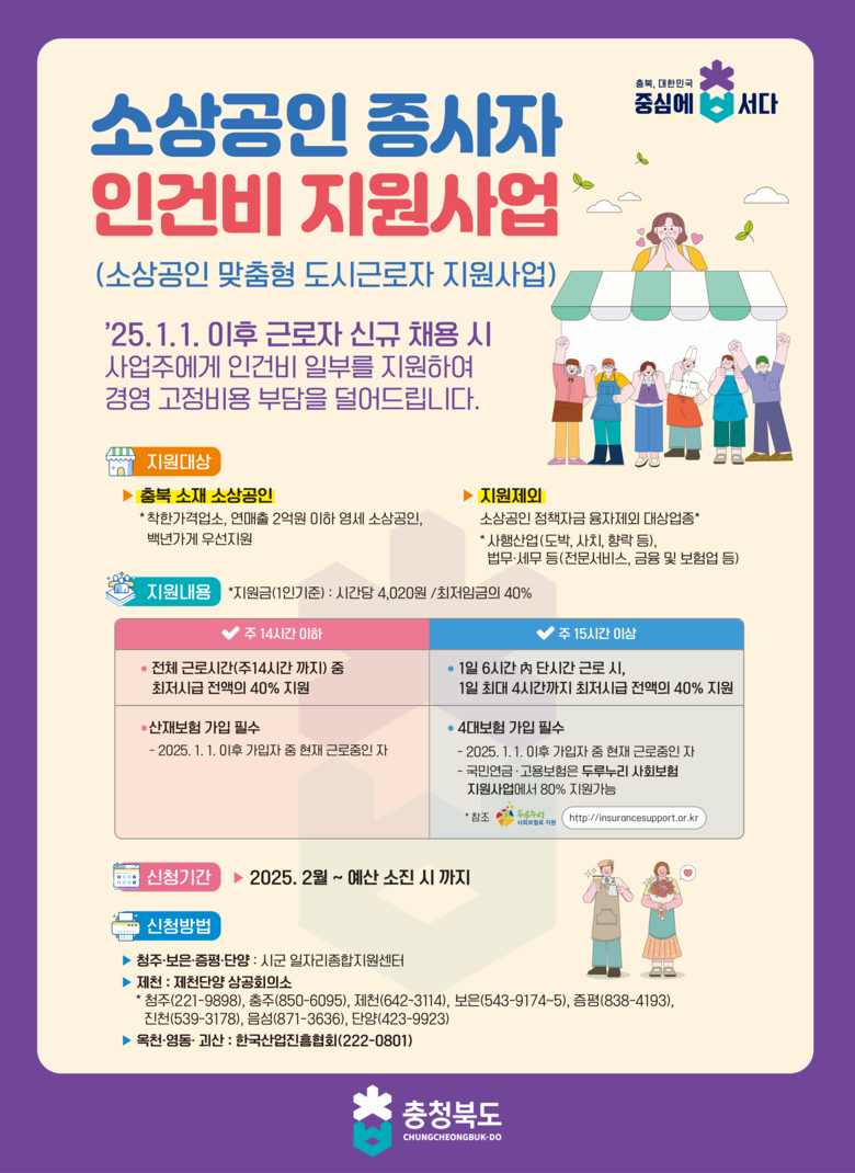 한편, 충북형 도시근로자 지원사업은 근로를 희망하는 도민이면 누구나 참여 가능하며, 기업과 소상공인은 참여자와 근로계약 체결 후 근로 임금을 지급하고, 지자체에서는 1일 최대 4시간까지 최저시급(10,030원)의 40%에 해당하는 인건비와 교통비 및 근속 인센티브를 별도로 지원하고 있다.