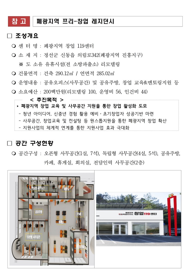 * 프리-창업 레지던시 : 사무공간 무상 지원, 창업 교육 및 컨설팅, 공유주방 및 지역친화 복합문화공간 제공 등 창업지원 계획(참고자료 참조)