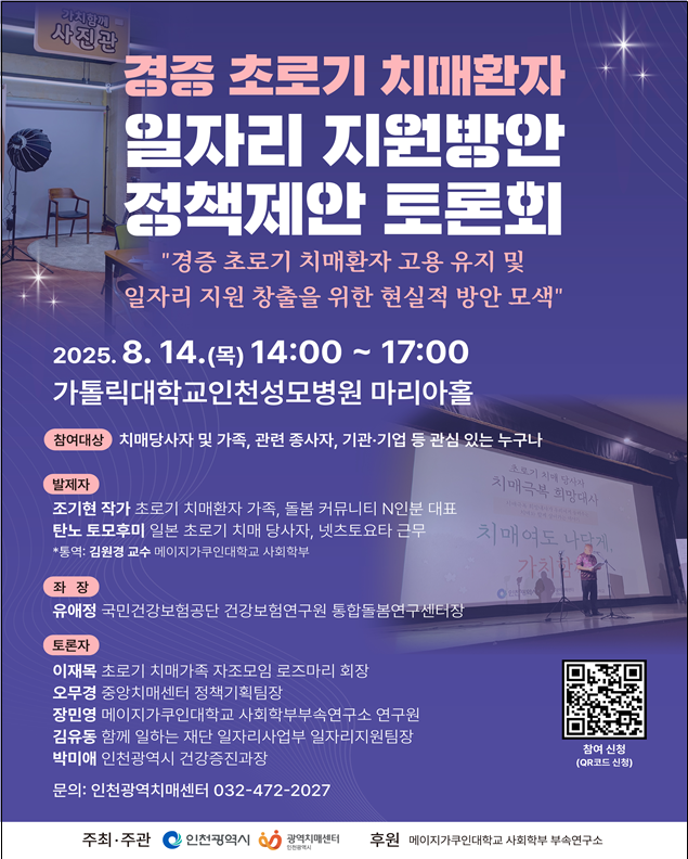 이번 토론회는 ▲초로기 치매환자의 일자리 유지 ▲사회적 참여 확대 ▲사회 인식 개선 등 다양한 측면에서 실질적인 대응방안을 모색하는 자리로 마련된다. 특히 발제자로는 초로기 치매 가족인 조기현 대표(돌봄 커뮤니티 ‘N인분’)와 현재 일본 넷츠 도요타에서 근무 중인 초로기 치매 당사자 탄노 토모후미 씨가 참여해, 당사자와 가족이 겪는 현실과 필요한 지원에 대해 생생한 목소리를 전달할 예정이다. 이는 인천시의 적극행정을 통해 환자 본인과 가족이 함께 정책 논의에 참여하는 현장 정책 추진 사례로 당사자의 목소리를 반영한 생활 밀착형 정책 개발의 좋은 본보기가 될 것으로 기대된다.