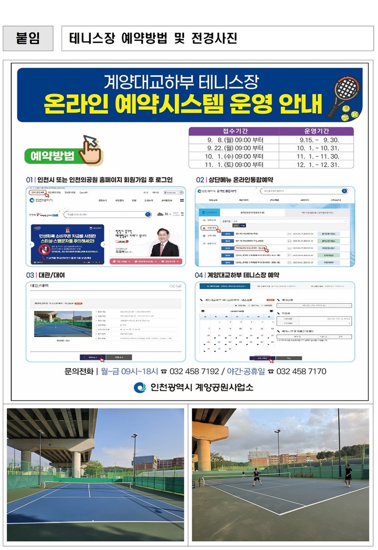 유정복 인천광역시장은 “시민의 건강과 행복은 도시의 가장 큰 자산이다”라며 “계양대교 하부 테니스장은 누구나 편리하게 이용할 수 있는 생활체육공간으로, 시민들이 활기차고 건강한 일상을 누릴 수 있는 기반이 될 것”이라고 말했다.