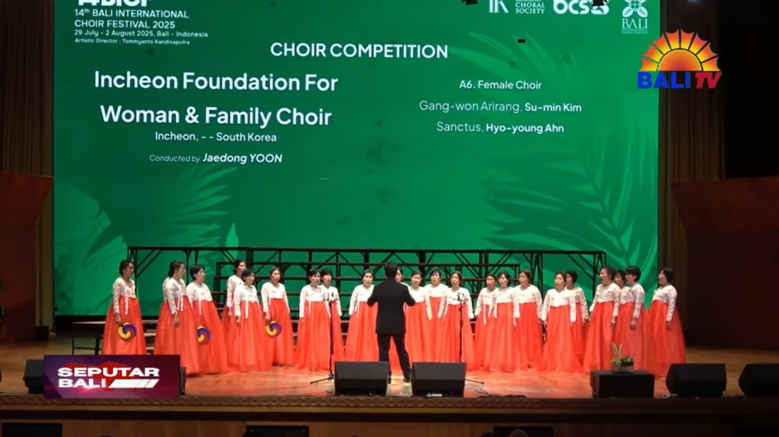 [인천 세계타임즈=심하린 기자] 인천여성가족재단 합창단(대표이사 김미애)이 인도네시아 발리에서 열린‘제14회 발리 국제합창제(14th Bali International Choir Festival)’에서 여성합창 부문 금상(Gold Medal)을 수상하며 국제무대에서 음악성과 예술성을 인정받았다.