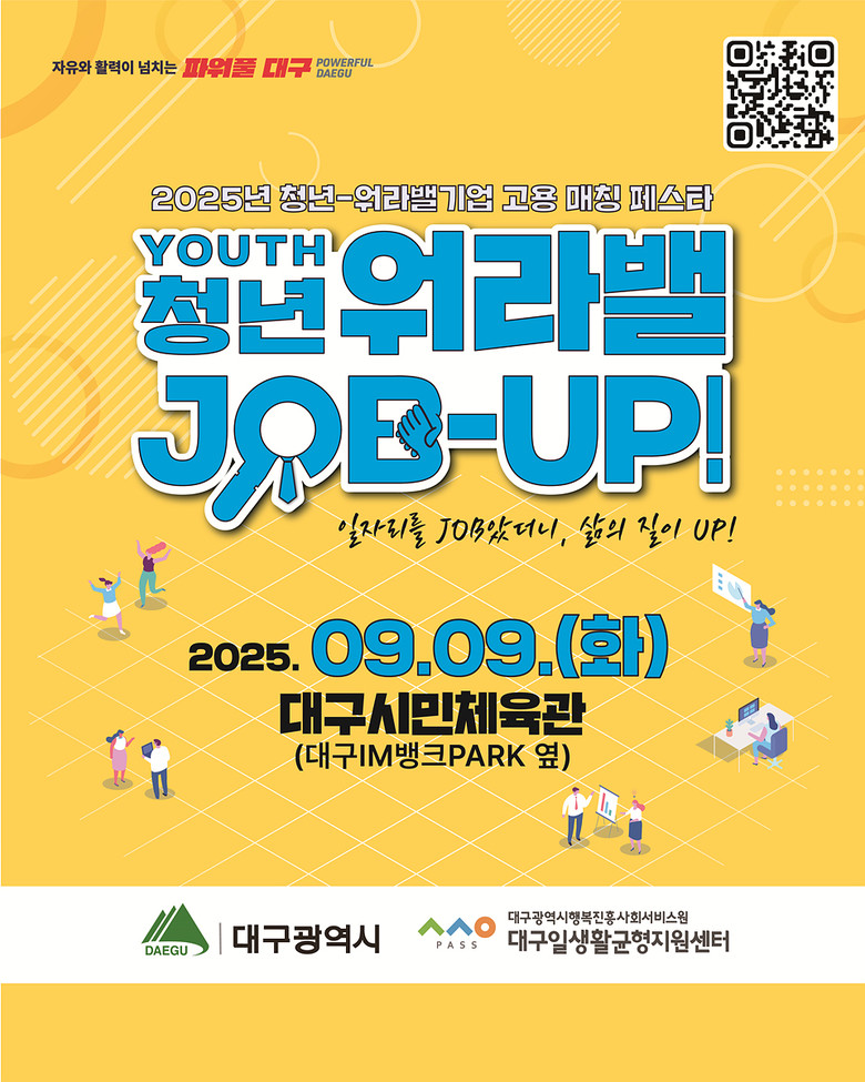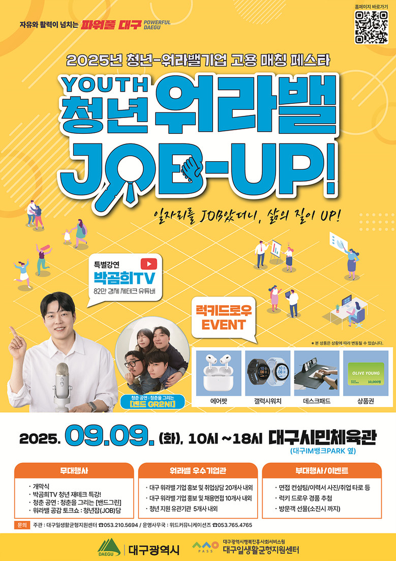 박윤희 대구광역시 청년여성교육국장은 “청년들이 대구에 정착하고 자신의 일과 삶을 균형 있게 설계할 수 있도록 앞으로도 일자리 매칭과 워라밸 문화 확산에 최선을 다하겠다”며, “이번 페스타가 청년들에게는 새로운 취업의 기회가 되고, 기업에는 우수한 지역인재를 확보하는 소중한 장이 되길 바란다”고 말했다.