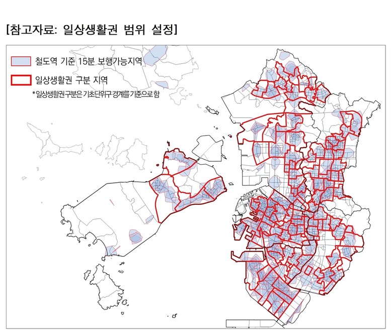 이에 따라 이 연구는 생활인구 지표와 15분 일상생활권 개념을 활용해, 시민의 실제 생활 행태를 반영한 진단을 시도했다. 철도역 중심 15분 보행권을 기본 단위로 설정한 뒤, 도로 연결성과 용도지역 등을 종합해 실제 생활권을 재구성하고, 상주인구·직장인구·방문인구로 구성된 생활인구 지표를 통해 일상생활권의 성격과 기능을 유형화했다.