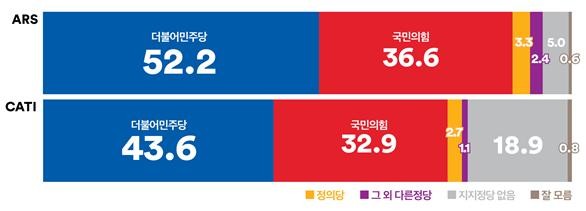 같은 기간 실시한 전화 면접조사에서는 더불어민주당 정당 지지율은 1.9%p 상승한 43.6%, 국민의힘은 3.0%p 상승한 32.9%로 양당 모두 지지율 증가한 가운데 무당층은 4.3%p 하락한 18.9%로 집계됐다. 이번 주 인천·경기와 강원·제주 지역을 제외한 그 외 지역에서 무당층이 감소하며 양당 지지율이 동반 상승하는 특성을 보였다.
