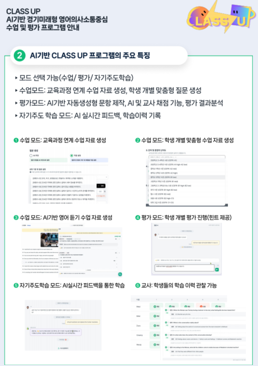 ‘클래스 업(CLASS UP, Communicative Listening And Speaking Skills Up)’은 도교육청이 자체 개발한 인공지능(AI) 기반 듣기·말하기 중심 수업·평가 지원 영어교육 프로그램이다. 기존 EBS 영어 듣기평가를 보완·대체해 수업과 연계한 실제 의사소통 역량을 평가할 수 있다.