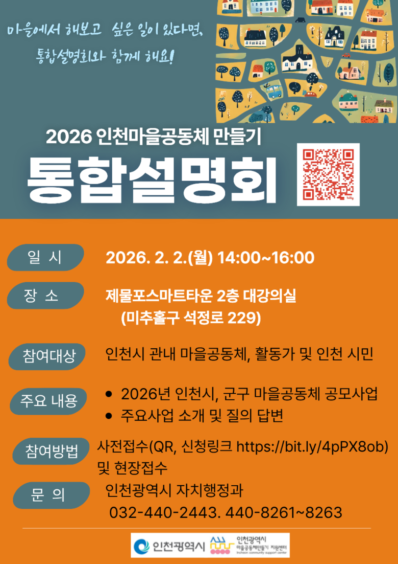 한편, 인천시는 설명회 이후에도 사전 컨설팅과 상담을 통해 공모사업 신청을 준비하는 공동체를 지속적으로 지원할 예정이며, 공모사업 신청 접수는 오는 2월 13일까지 진행된다.