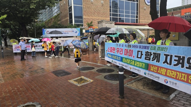 캠페인에는 대구시, 중구, 경대사대부초 교직원과 학생, 중부경찰서, 대구안전생활실천시민연합, 중구안전보안관 등 50여 명이 참석해 학생과 학부모들에게 유괴 예방 안전수칙을 적극 홍보했다.