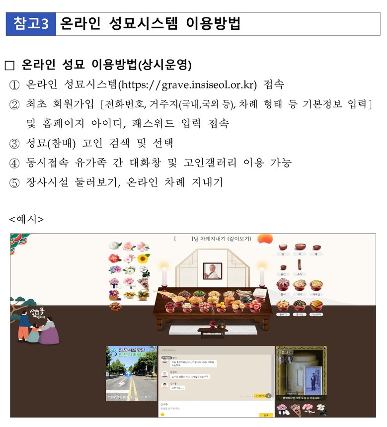 인천시가 2020년 전국 최초로 도입한 온라인 성묘 서비스는 지난해 설 명절에 약 2만 건이 이용될 정도로 시민들로부터 큰 호응을 얻었다. 온라인 성묘 서비스는 ▲온라인 차례 지내기 ▲고인 갤러리(사진·동영상) ▲유가족 메신저 ▲고인 위치 안내 서비스 등을 제공하며, 인천가족공원 온라인성묘 누리집(https://grave.insiseol.or.kr) 에서이용할 수 있다.