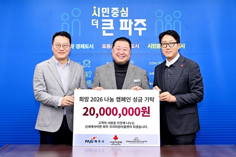 김경일 파주시장은 “신세계사이먼 파주 프리미엄 아울렛의 따뜻한 성금에 감사드리며, 관내 어려운 이웃들이 새해를 시작하는 데 큰 힘이 될 것”이라며 “전달받은 성금은 도움이 필요한 곳에 소중히 사용하겠다”라고 전했다.