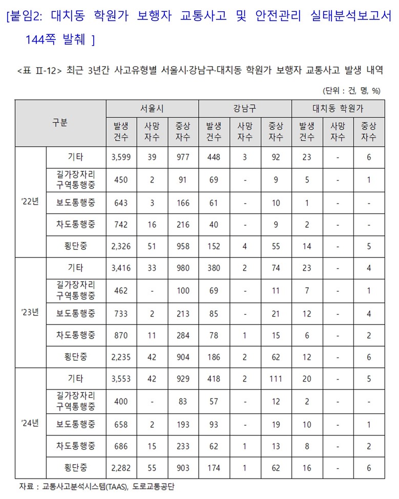 피해자 분석 역시 상황의 심각성을 보여준다. 최근 3년간 대치동 학원가 보행자 사고 피해자 총 161명 중 48.5%인 78명이 20세 이하 학생층으로(12세 이하 36명, 13~20세 42명), 학원가를 이용하는 아이들이 교통안전 위험에 집중적으로 노출돼 있음이 통계로 확인됐다.