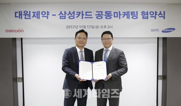 [세계타임즈 이영애 기자]대원제약(대표이사 부회장 백승열)과 삼성카드(대표이사 사장 원기찬)는 17일 서울 중구 삼성카드 본사에서 업무 제휴 협약을 체결하고 향후 빅데이터 및 디지털을 기반으로 한 공동마케팅을 함께 전개해 나가기로 하였다.