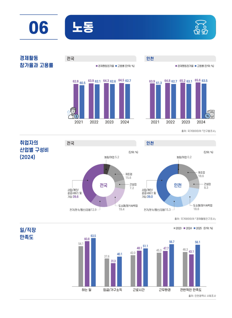 노동 분야에서는 2024년 기준 경제활동참가율이 65.6%로 전년 대비 0.4% p 상승했으며, 고용률은 63.5%(전년 63.1%), 실업률은 3.3%(전년 3.2%)로 조사됐다. 일자리 만족도 조사 결과, ‘하는 일’에 대한 만족도는 3.64점으로 가장 높았던 반면, ‘임금·가구소득’에 대한 만족도는 3.32점으로 가장 낮게 나타났다.