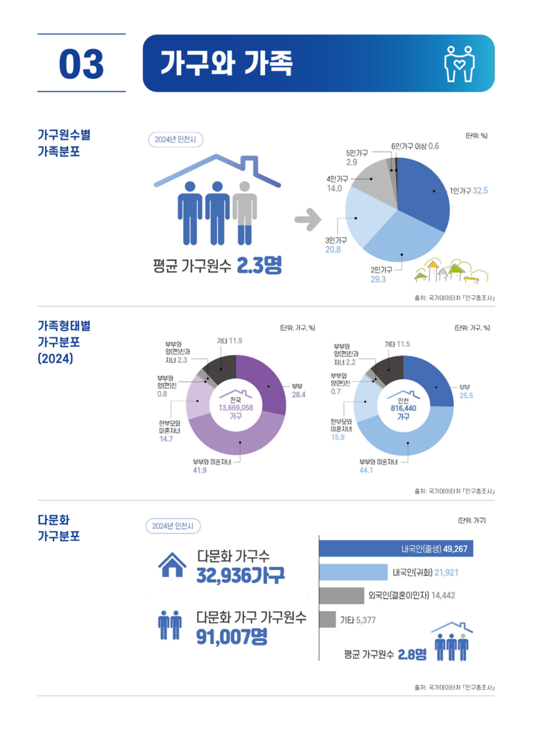 인구 분야에서는 저출생·고령화 흐름이 지속되고 있는 가운데, 세대당 가구원 수는 2.26명으로 최근 10년 중 최저 수준을 기록했다. 반면, 합계출산율은 0.76명으로 전년 대비 0.07명 증가해 전국 평균(0.75명)을 소폭 상회했다. 외국인 등록 인구는 89,126명으로 전년 대비 8,113명 증가한 것으로 나타났다.