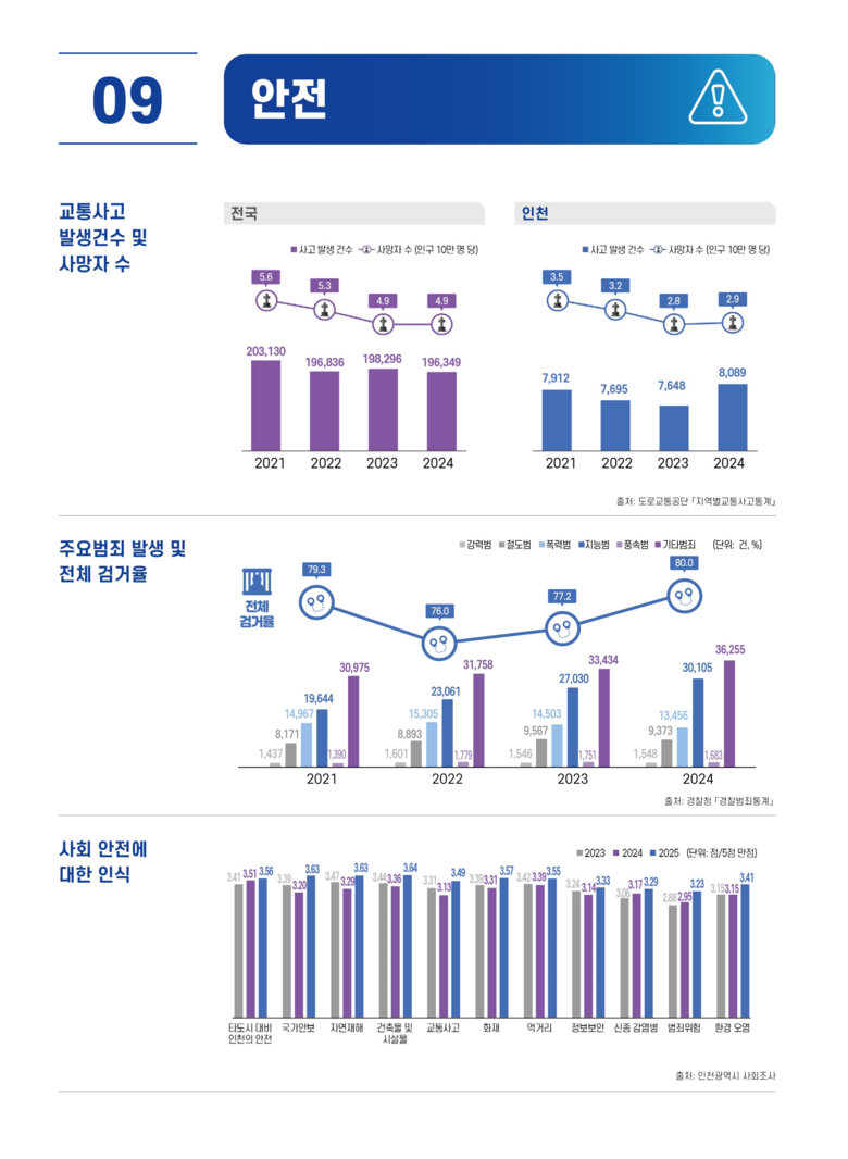 안전 분야에서는 타 도시 대비 인천이 안전하다는 인식이 3.56점으로 전년(3.51점) 대비 0.05점 상승했으며, 시민들이 가장 우선적으로 시행해야 할 안전사업으로는 ‘자연재해 예방사업’(33.8%)을 꼽았다.