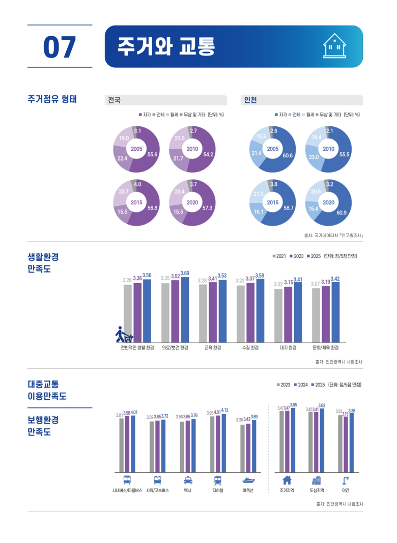 환경 분야에서는 녹지환경(3.58점), 수질(3.55점), 토양(3.49점) 등 환경 체감도가 전반적으로 개선됐으며, 인천시 녹지율은 56.8%로 전국 평균(71.2%) 대비 14.1% p 낮은 수준으로 나타났다. 거주지역에서 가장 우선적으로 해결해야 할 과제로는 ‘주거복지’(23.6%)가 가장 높게 나타났으며, 다음으로 ‘노인복지’(22.9%), ‘청소년복지’(15.6%) 순으로 조사됐다.