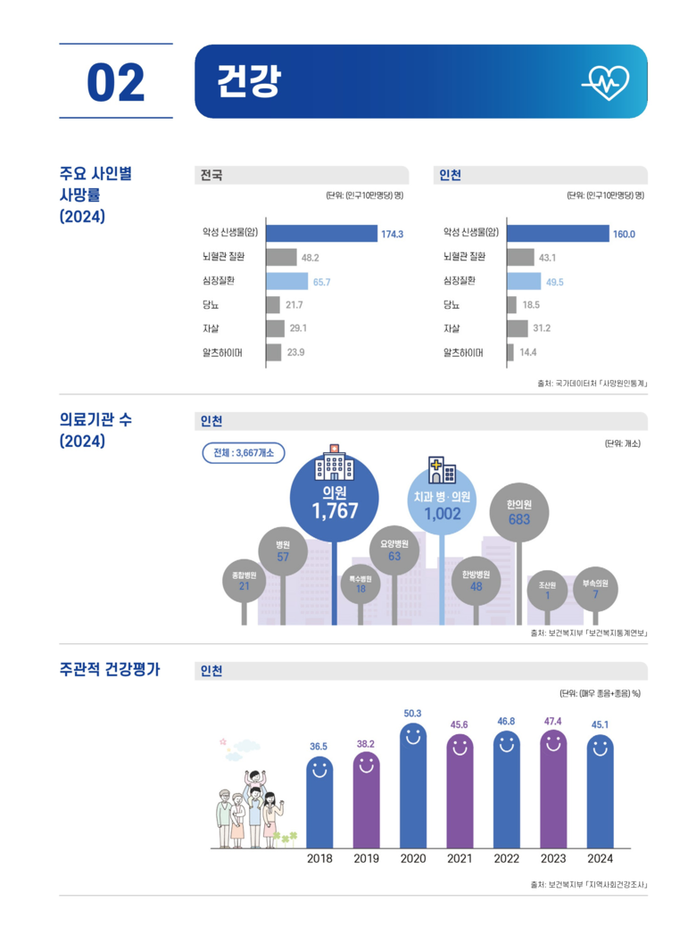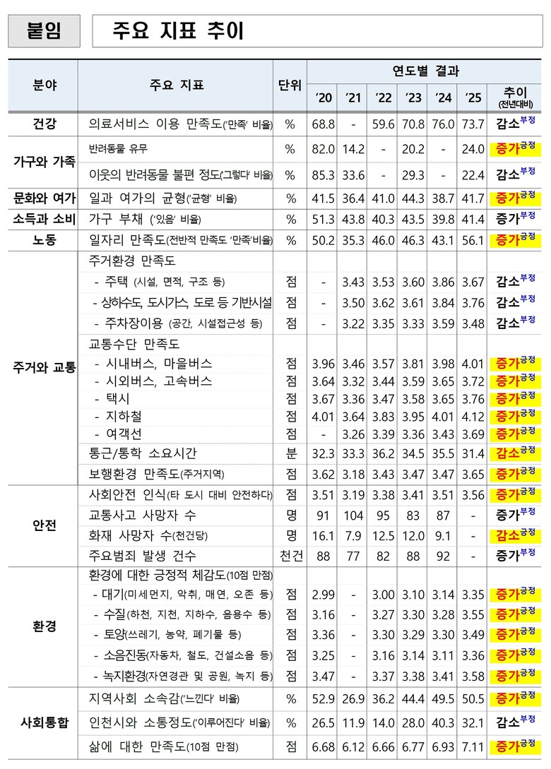 신승열 시 기획조정실장은 “이번 2025년 인천사회지표조사를 통해 시민의 삶의 만족도와 사회 전반의 체감 지표가 개선되고 있음을 확인할 수 있었다”며, “앞으로도 인천사회지표를 시민 중심 정책 수립을 위한 핵심 기초자료로 활용해 시민이 체감하는 변화를 만들어 나가겠다”라고 말했다.