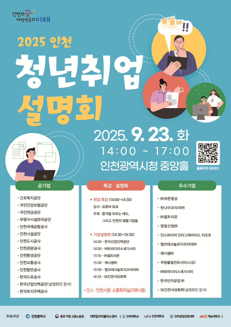 설명회는 인천시와 중부지방고용노동청, 인하대학교·인천대학교·인하공업전문대학·재능대학교 대학일자리플러스센터가 공동 주최하며, ‘2025년 인천 상설 채용박람회’의 네 번째 일정으로 진행된다.