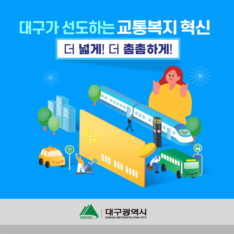 ※ (광역환승제) 대구와 경북 8개 지자체 연결, 대중교통 요금 50% 절감 효과(어르신 무임교통카드 상호 이용) 70세 이상 어르신, 대구와 경북 8개 지자체서 대중교통카드 무임 사용(대구형 DRT) 대중교통 취약지역인 북구 연암서당골, 수성구 범물동에 DRT 확대