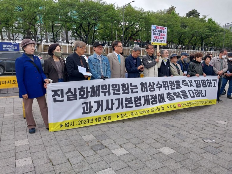 [세계타임즈 백진욱 기자] 한국전쟁전후민간인피학살자 전국유족회(이하 피학살자 전국유족회) 대표단이 지난 4월 20일(목) 정오부터 1시까지 약 1시간 동안 회원 등 약 20여명이 용산 대통령 집무실 건너편 인도 앞에서 윤석열 대통령에게 <진실화해위원회 허상수 위원을 즉시 임명하고 과거사기본법 개정하라!>고 요구하는 기자회견을 개최했다. 즉, “특정인을 임명에서 배제하려고 무리수를 두지 말고 공석 중에 있는 7인 위원 전원을 즉각 임명하고, 국회는 행안위 법안소위에 장기간 상정 계류 중인 관련법 개정안을 즉각 통과시켜라”고 촉구했다.