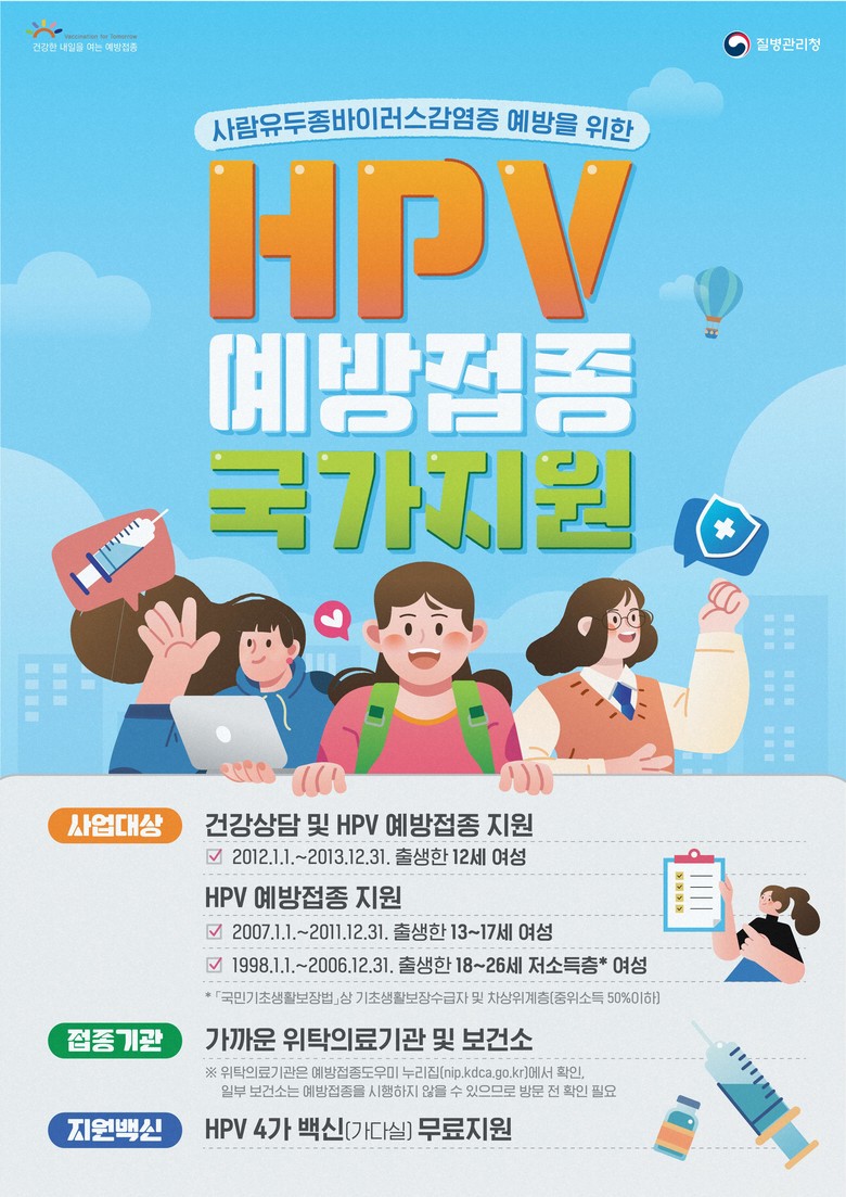 신병철 시 보건복지국장은 “올해 무료 접종 마지막 대상자인 2007년생 여성 청소년과 1998년생 저소득층 여성은 기한 내 꼭 예방접종을 받으시길 권장한다”며 “예방접종을 통해 면역력을 키우고, 건강하고 즐거운 방학기간을 보내시길 바란다”라고 말했다.