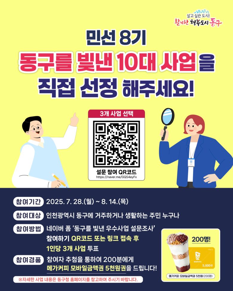 구는 투표가 종료되면 심사를 거쳐 9월 중‘동구를 빛낸 10대 사업’을 최종 선정. 공개할 예정이다. 또한, 투표 참여자 중 200명을 추첨해 5,000원 상당의 커피 기프티콘을 제공하며, 선정 사업 유공 공무원에게는 인센티브도 지급할 예정이다.