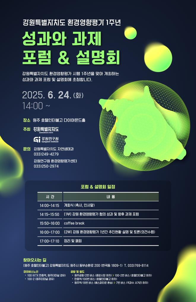 강원특별자치도 관계자는 “이번 포럼과 설명회를 통해 도민과 현장의 목소리를 적극 반영하고, 환경과 개발이 조화를 이루는 실질적인 제도 개선에 나서겠다”며 “환경영향평가 제도의 성공적 정착을 위해 많은 관심과 참여를 부탁드린다”고 밝혔다.