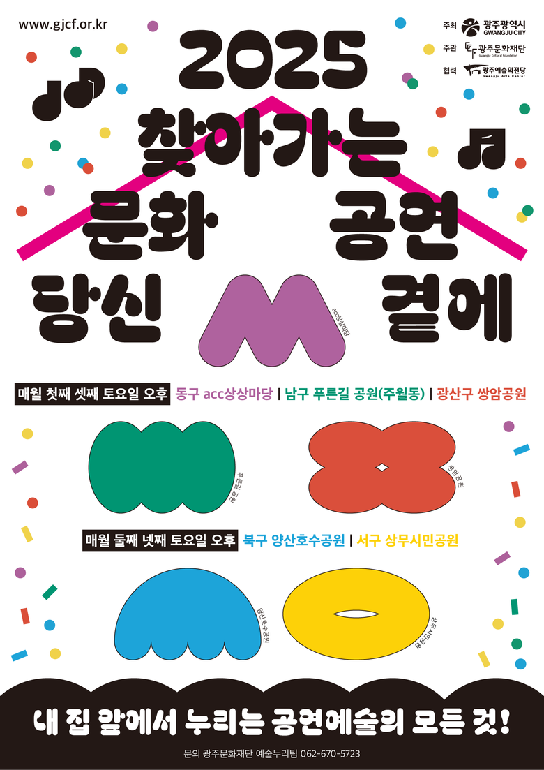광주광역시(시장 강기정)는 4월부터 11월까지 매주 토요일 동구 국립아시아문화전당(ACC) 상상마당, 서구 상무시민공원, 남구 푸른길공원, 북구 양산호수공원, 광산구 쌍암공원 등 5곳에서 ‘찾아가는 문화공연’을 연다.
