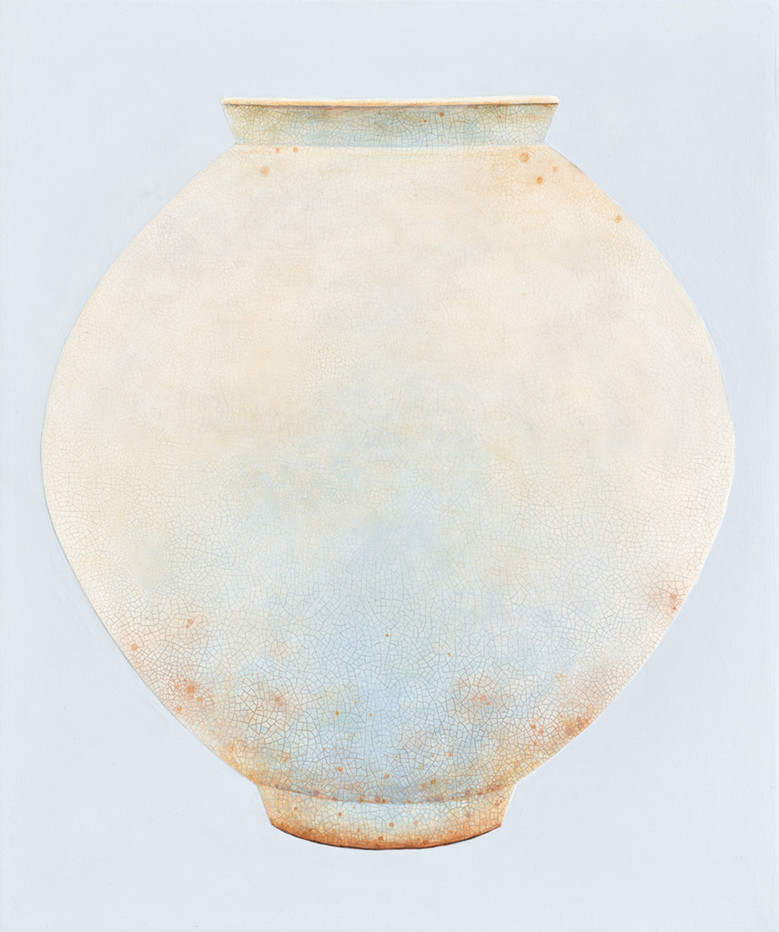 서양화 재료를 활용하여 전통 달항아리 형상의 이미지를 만들어 동서양의 혼합이라고 할 수 있다. 캔버스 위에 두께감 있게 재료를 입혀 저부조 형태를 띠고 있으며 좌우대칭의 균형미가 안정감을 전달한다. 달항아리 표면은 도자기처럼 매끈거리며 윤기 나고 자잘한 갈라짐(빙렬)이 구현되어 오래된 골동품을 보는듯하다. 재료의 특성에 따른 마름의 차이가 갈라짐을 만들고, 계산된 시차에 의해 선이 굵고 가늘게 만들어져 도자기의 느낌을 제대로 살렸다. 억지스럽지 않고 자연스럽게 표현된 도자기 그림의 형태가 조선의 예술정신까지 체감할 수 있게 해 준다.