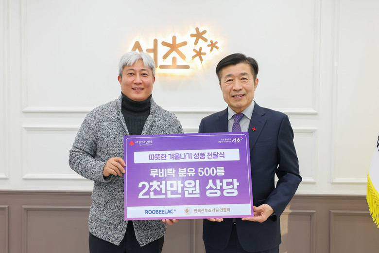 [서초구 세계타임즈=이장성 기자] 서울 서초구(구청장 전성수)는 지난 28일 서초구청 5층 구청장실에서 한국산후조리원연합회(대표 이석범)와 따뜻한 겨울나기 이웃돕기 전달식을 개최했다고 밝혔다. 이날 전달식에는 전성수 서초구청장, 한국산후조리원연합회 이석범 대표와 관계자 등이 참석하여 자리를 빛냈다.