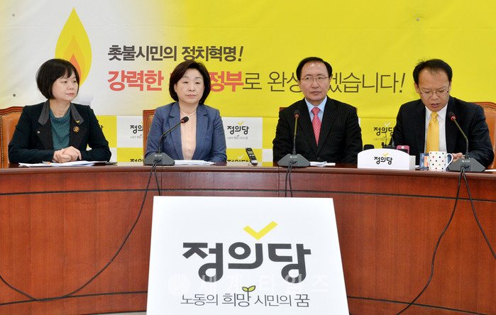 27일 오전 서울 여의도 국회 정의당 당 대표실에서 심상정(왼쪽 두번째) 상임대표 주재 상무위원회가 열리고 있다. 왼쪽부터 이정미 의원, 심 대표, 노회찬 원내대표, 나경채 공동대표. 2017.02.27.