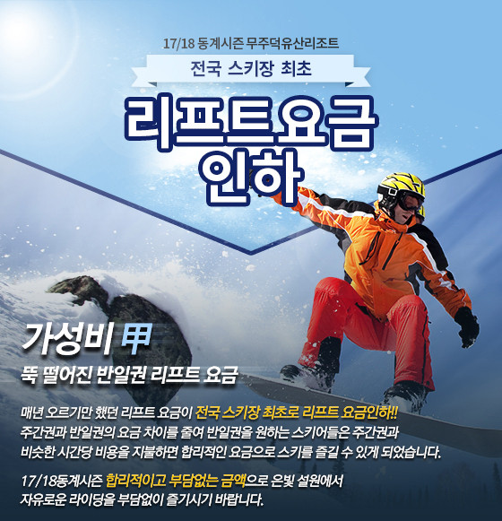 부영그룹 계열 무주덕유산리조트(대표 김시권, http://www.mdysresort.com) 스키장이 리프트 요금을 대폭 인하했다. 이용객들은 단순 할인이 아닌 요금 자체를 인하한 것은 처음이라는 반응이다.