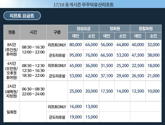 시간으로 계산할 경우 16/17시즌 8시간권은 시간당 9500원, 4시간권은 1만5000원으로 1.6배가량 차이가 났던 것을, 17/18 시즌에는 8시간권은 시간당 1만원, 4시간권은 시간당 1만1000원선이다.