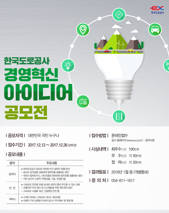 공모분야는 ‘공사 업무와 관련된 민간 일자리 창출 방안’, ‘안전한 고속도로 이용을 위한 교통안전 의식 제고 및 제도개선 방안’, ‘고객이 원하는 고속도로 서비스 개선사항’ 등 경영전반에 대한 사항으로 자유롭게 아이디어를 제출하면 된다. 자세한 내용은 한국도로공사 홈페이지에서 확인할 수 있다.