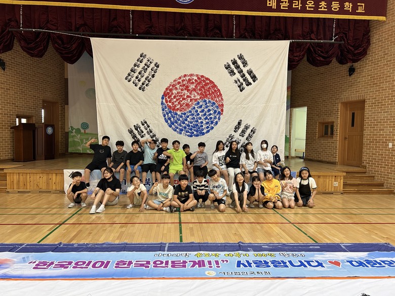 [시흥시 세계타임즈=송민수 기자] 배곧라온초등학교 5학년에서는 2024년 6월 24일(월) 호국보훈의 달을 맞아 나라사랑 계기교육을 특별한 방법으로 진행하였다. 학생들이 자신의 손도장을 찍어 5학년 전교생이 함께 태극기를 완성하는 ‘손도장 태극기 100만 챌린지’행사를 진행하였다.