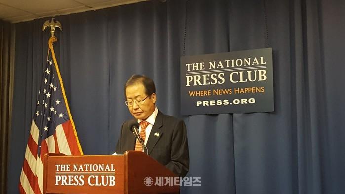 홍준표 자유한국당 대표는 26일(현지시간) 오후 워싱턴 D.C.에 위치한 내셜널프레스클럽에서 연설을 하고 "도널드 트럼프 대통령이 북한을 대하는 방식은 아주 적절한 방식"이라고 평가했다.