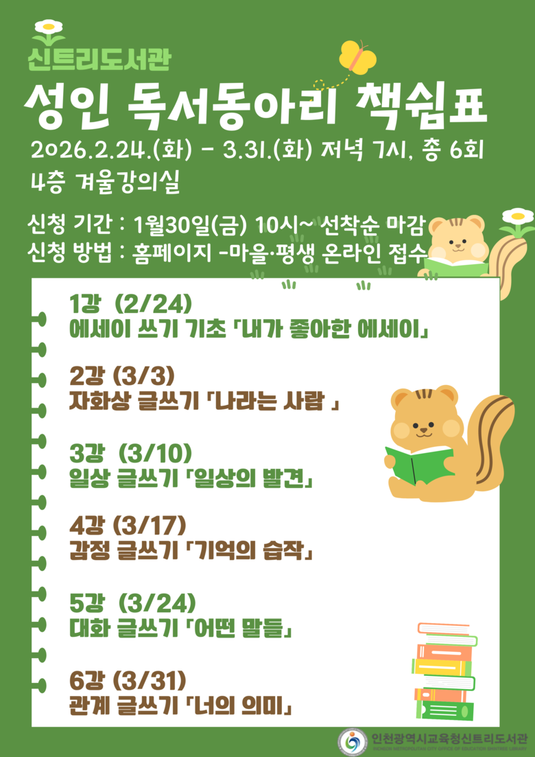 프로그램은 2월 24일부터 3월 31일까지 6회에 걸쳐 운영되며, 모집은 1월 30일부터 2월 18일까지 신트리도서관 누리집에서 선착순으로 진행된다.