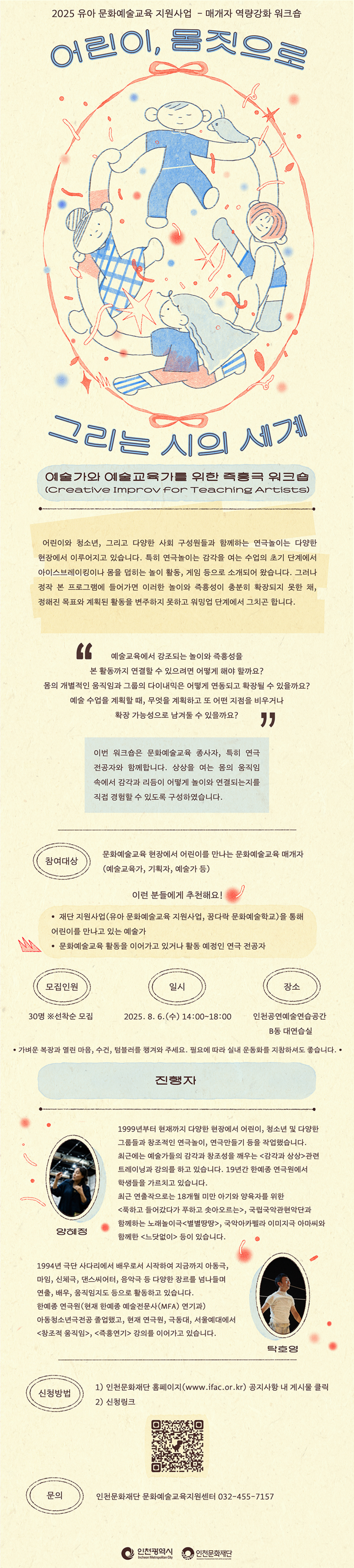 워크숍 진행은 영유아극 연출가이자 연극놀이 전문가인 양혜정 그리고 연극배우이자 마임이스트인 탁호영이 공동으로 맡는다.