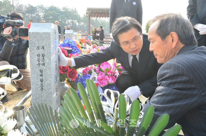 황교안 대통령 권한대행 국무총리가 24일 오전 충남 대전시 유성구 국립대전현충원 현충광장에서 열린 제2회 서해수호의 날 기념식에 참석해 제2연평해전·연평도 포격전 전사자 묘역에 참배 후 유족들을 위로하고 있다. 2017.03.24.