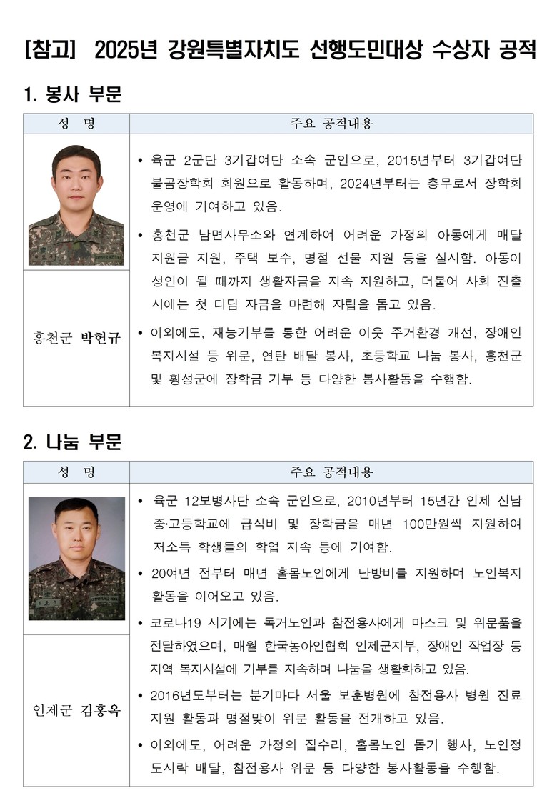 봉사 부문 수상자 박헌규 씨는 2015년부터 육군 제3기갑여단 ‘불곰장학회’ 활동을 통해 생계가 어려운 가정 아동에게 매달 지원금을 전달하고, 주택 보수, 명절 선물 지원 등 실질적인 생활 지원을 꾸준히 이어오고 있다. 또한 연탄 배달, 복지시설 위문, 재능기부 등 다양한 봉사활동으로 지역사회에 이바지해왔다.