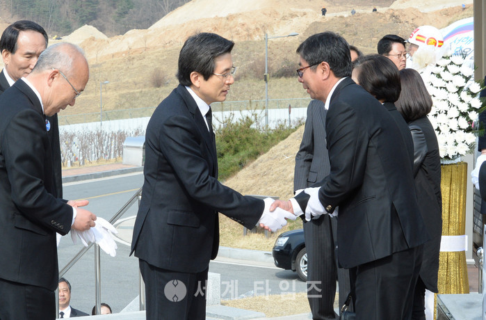 황교안 대통령 권한대행 국무총리가 24일 오전 충남 대전시 유성구 국립대전현충원 현충광장에서 열린 제2회 서해수호의 날 기념식에 참석해 제2연평해전·연평도 포격전 전사자 묘역에 참배 전 유족들과 인사하고 있다. 2017.03.24.