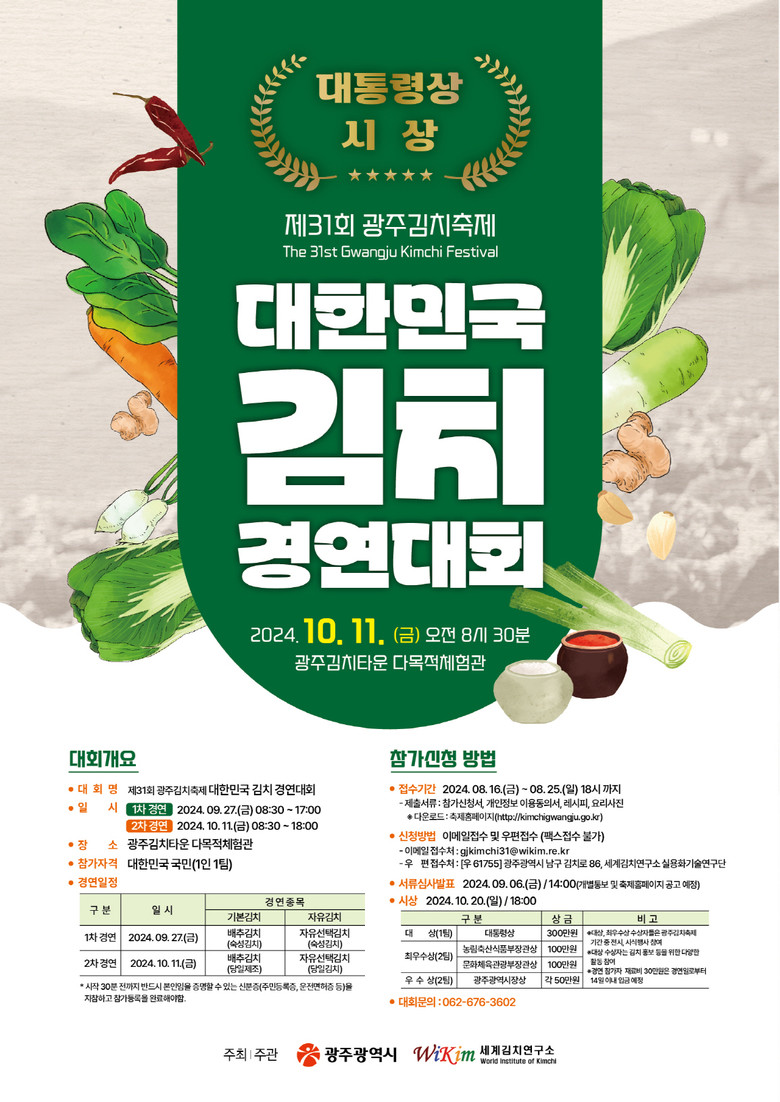 남택송 농업동물정책과장은 “다양한 참가자들이 대한민국 김치 경연대회에서 김치의 전통과 창의성을 발휘할 수 있는 기회가 되길 바란다”며 “김치에 대한 관심과 인식을 높이는 계기가 되기를 기대한다”고 말했다.