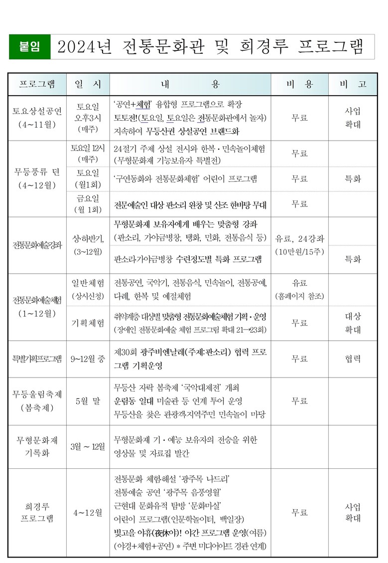 이 밖에 무형문화재 전수교육, 기·예능 보유자의 전승자료 구축, 영상콘텐츠 제작 등 무형문화재 기록화사업을 지속 추진하고, 창설 30주년을 맞는 ‘제15회 광주비엔날레’(주제 : 판소리-모두의 울림)와 협업해 전통문화예술의 지평을 넓힌다.