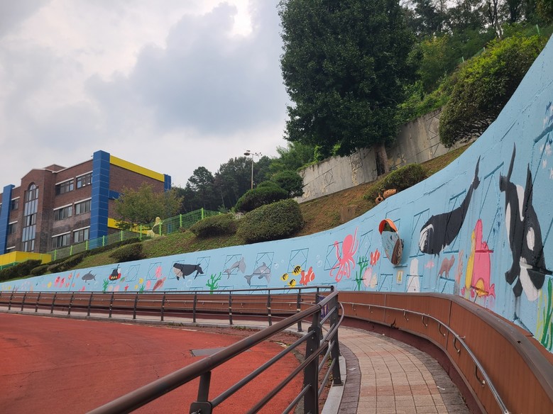 여러 가지 바다 동식물을 주제로 초등학생들의 눈높이를 고려하여 오르막길 벽면을 생기있고 아름답게 디자인하였다. 학교와 지역사회가 함께하는 이번 벽화 그리기 활동으로 학교 등굣길 교육환경 개선은 물론 지역 주민들에게도 볼거리를 제공하였다.